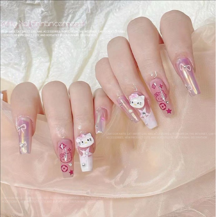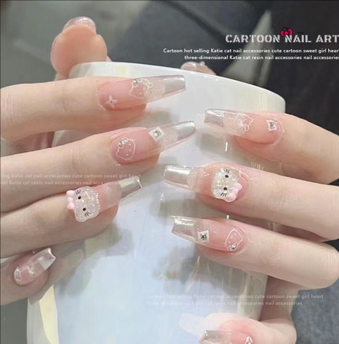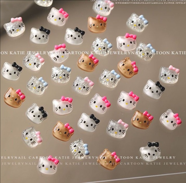 ハローキティ 立体ネイルパーツ|細ラメ入り クリア樹脂 リボン&猫フェイス ネイルデコ キャラクター美甲アクセサリー
